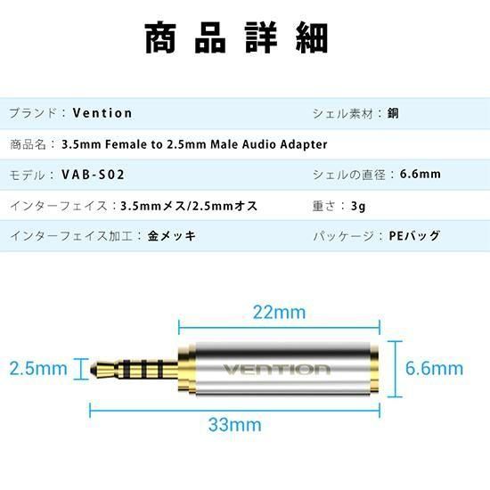 【商品詳細】 ブランド:Vention シェル素材:銅 商品名:3.5mm Female to 2.5mm Male Audio Adapter モデル:VAB-S02 シェルの直径:6.6mm インターフェイス: 3.5mmメス/2.5mmオス 重さ:3g インターフェイス加工:金メッキ パッケージ:PEバッグ